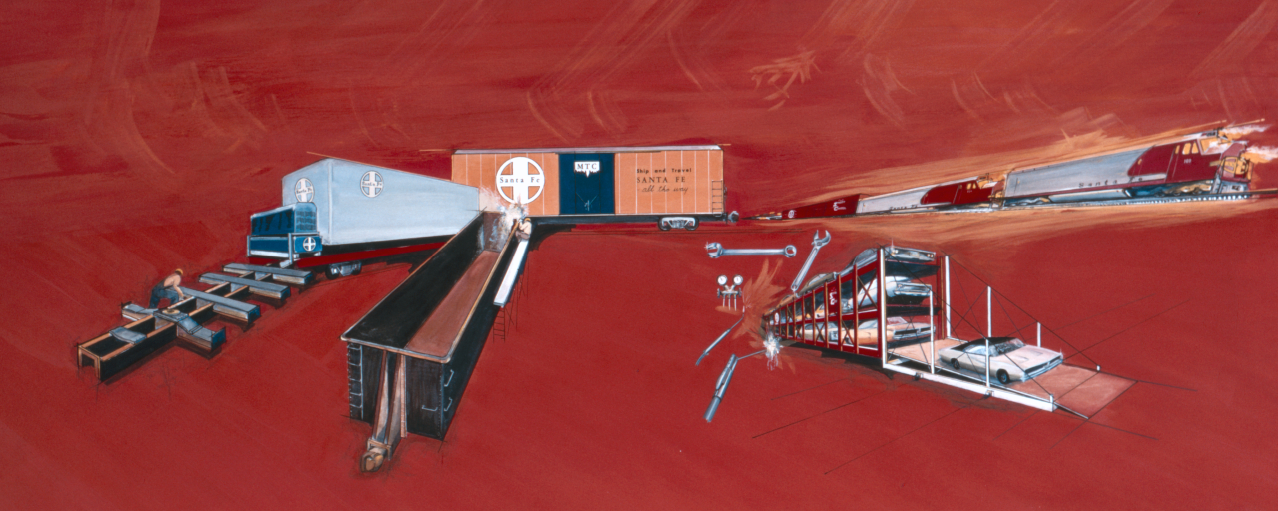Santa Fe, Topeka Motive Power Building, KS, 9-1968. Locomotive Simulator Training Displays drawn by Industrial Artist Fred Steig.
