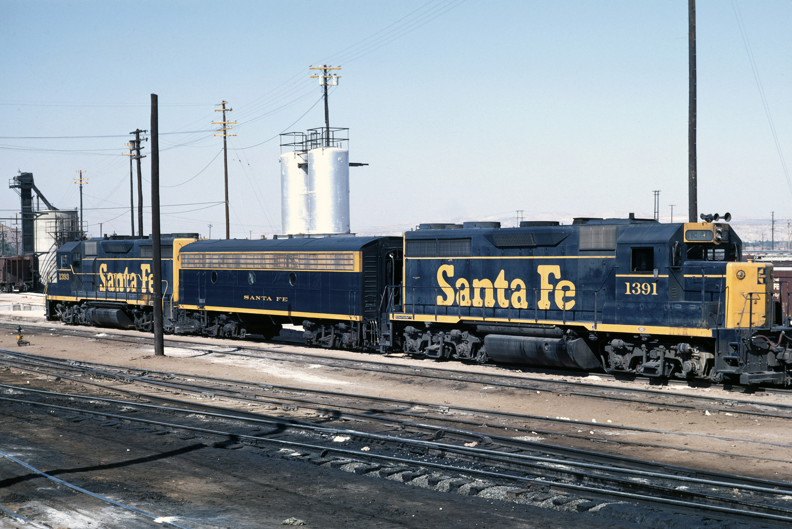 Santa Fe Locotrol consist, GP 35s 1391 & 1393, Locotrol Control Car #10. Barstow, CA, 9/1968. Locotrol was the predecessor to what is today called DPUs.