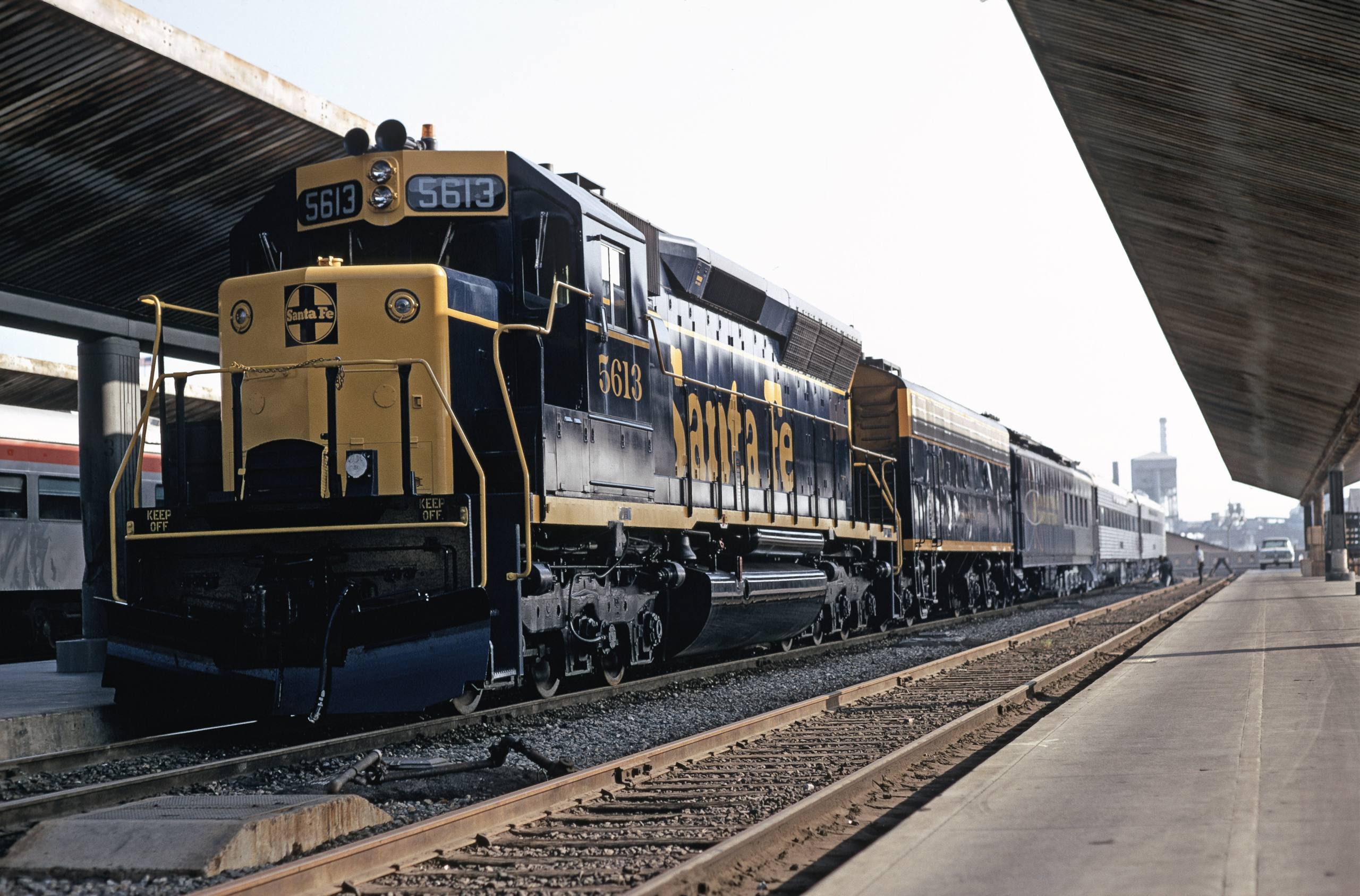 Santa Fe Progress Train. The train consisted of new SD45 5613, a Locotrol relay unit (a former F7B), a supply car, the Panorama of Progress exhibit car, Locomotive Simulator Car #5008 and a rider car for staff. Los Angeles, CA, 9/1969.