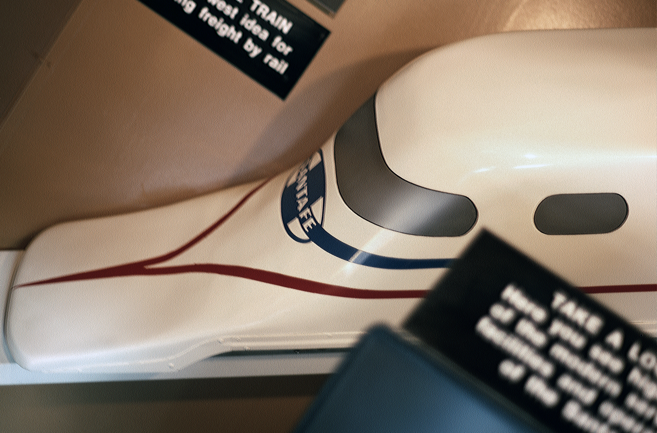 Santa Fe Panorama of Progress exhibition car. Concept modle of a container carrying coaxial train power car/locomotive. The car was in the Locomotive Simulator train bound in Los Angeles to be on display for local dignataries, politicians, union reps, and employees. Los Angeles, CA, 9/1969.