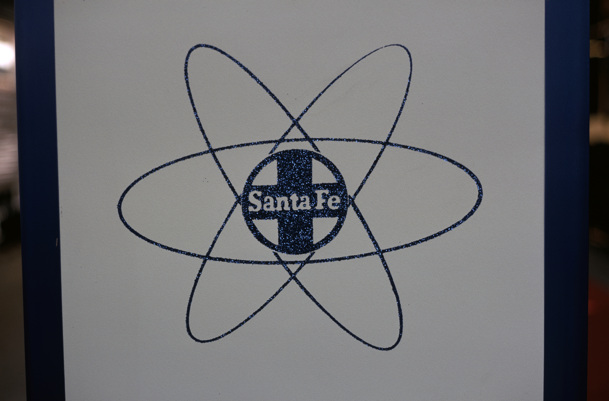 Santa Fe Hi-Tech symbols on display along wth the Locomotive Simulator train in Los Angeles to be on display for local dignataries, politicians, union reps, and employees. Los Angeles, CA, 9/1969.