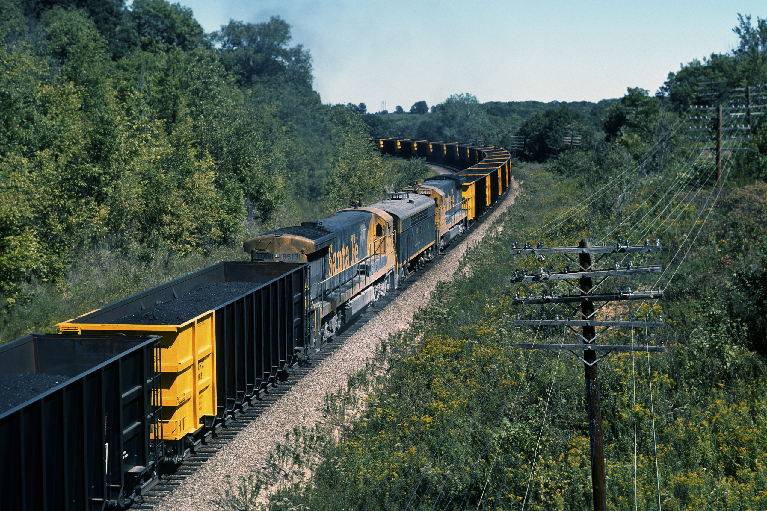 Santa Fe eastbound Illinois Power coal with mid-train RCE plus U33Cs 8519 & 8513. The Transcon, Bucklin, MO, 9/1977, MP 341.5.