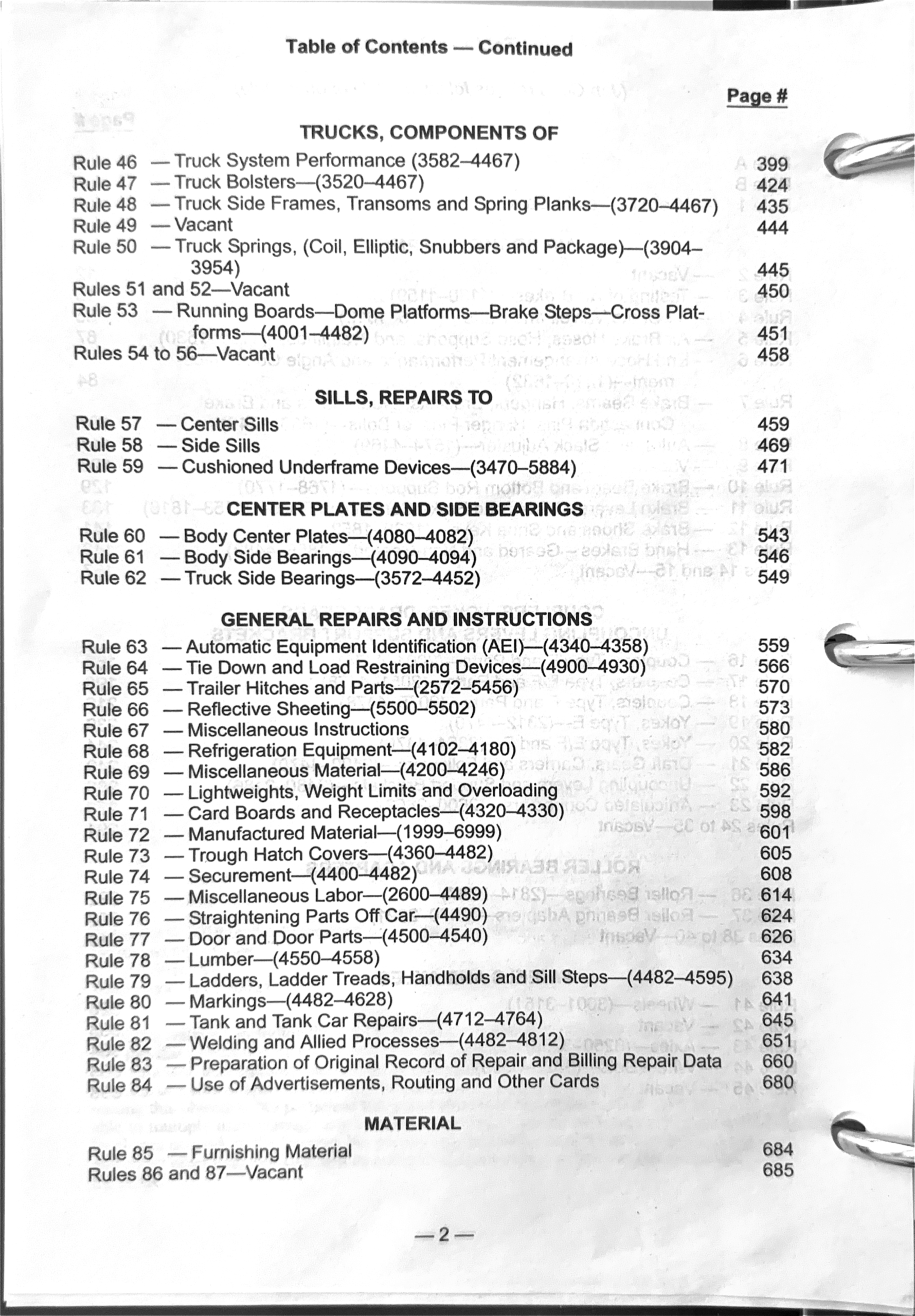 Sample page following the Table of Contents Page 1. Continues the listing of components, applicable rule, job code grouping and page number where the component(s) with the details will be found.